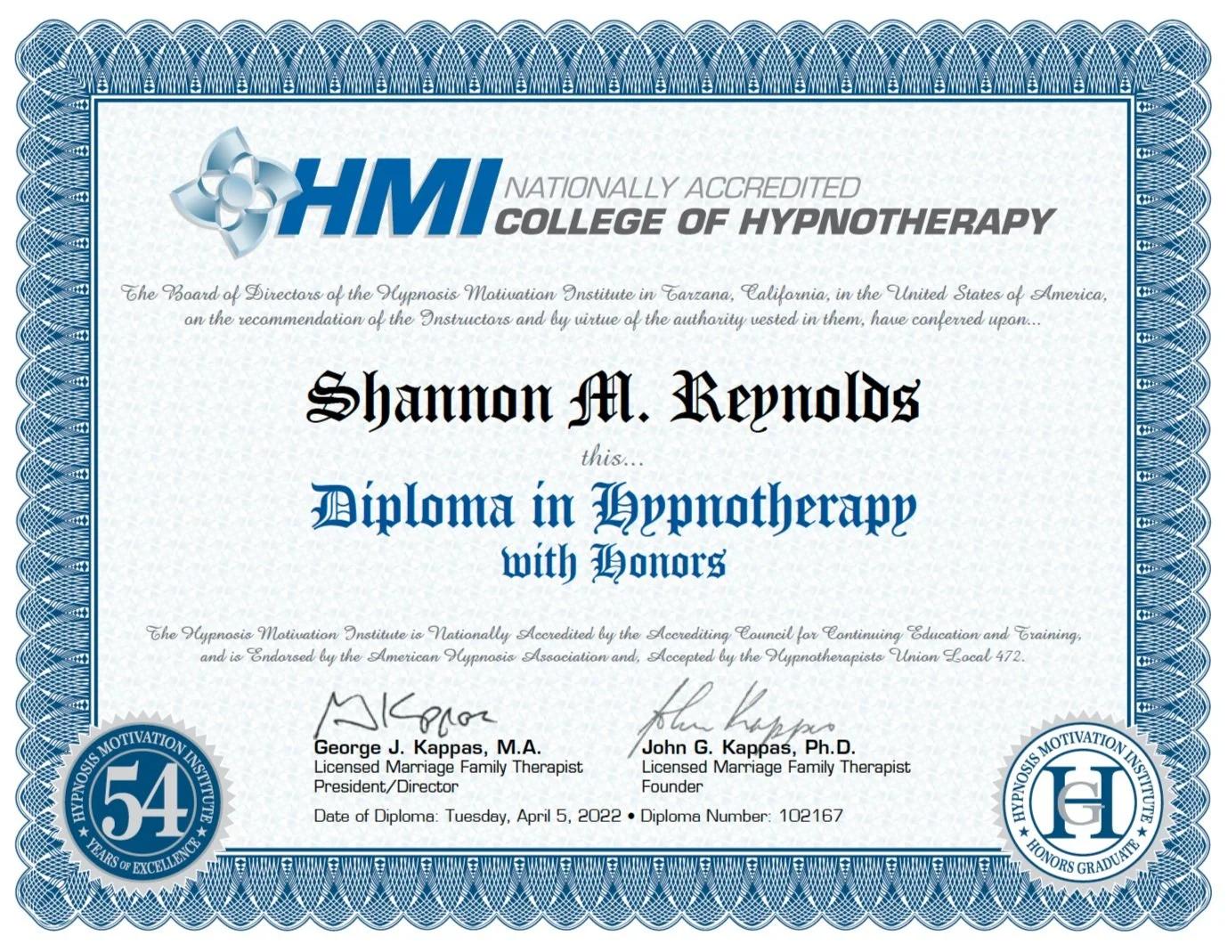 After passing the HMI introduction to Hypnotherapy Program to be accepted, I completed 200 clinical hours, and 52 courses and modalities, focusing on areas of specialties and therapeutic tools of hypnotherapy. I was able to participate in Clinical Case Conferences on zoom, guided and moderated by instructors, to examine and confer on case studies with hundreds of hypnotherapists across the world.